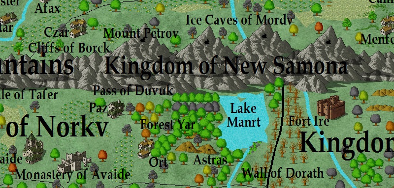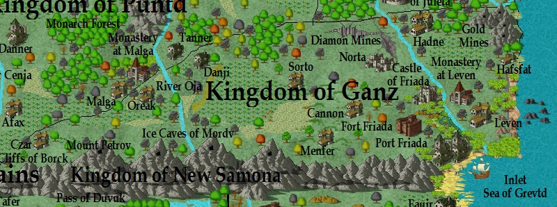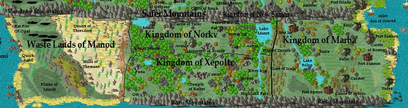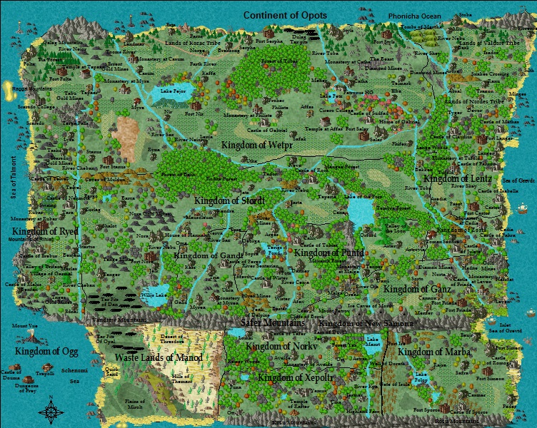 Continent of Opots Continent of Opots Lower Kingdoms Kingdom of Gandt Kingdom of Ganz Kingdon of Lentz Northern Lands Kingdon of Lentz Southern Lands Kingdom of Marba Kingdom of New Samona Kingdoms of Norkv and Xepoltr Kingdom of Ogg Kingdom of Puntd Kingdom of Ryed Kingdom of Stordt Kingdom of Stordt Southwest Lands Kingdom of Wetpr Easter Lands Kingdom of Wetpr Western Lands Kingdom of Zorta Waste Lands of Manod